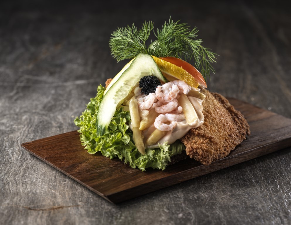 m/ 2 stegte fiskefilet, dampet fisk, rejer & dressing